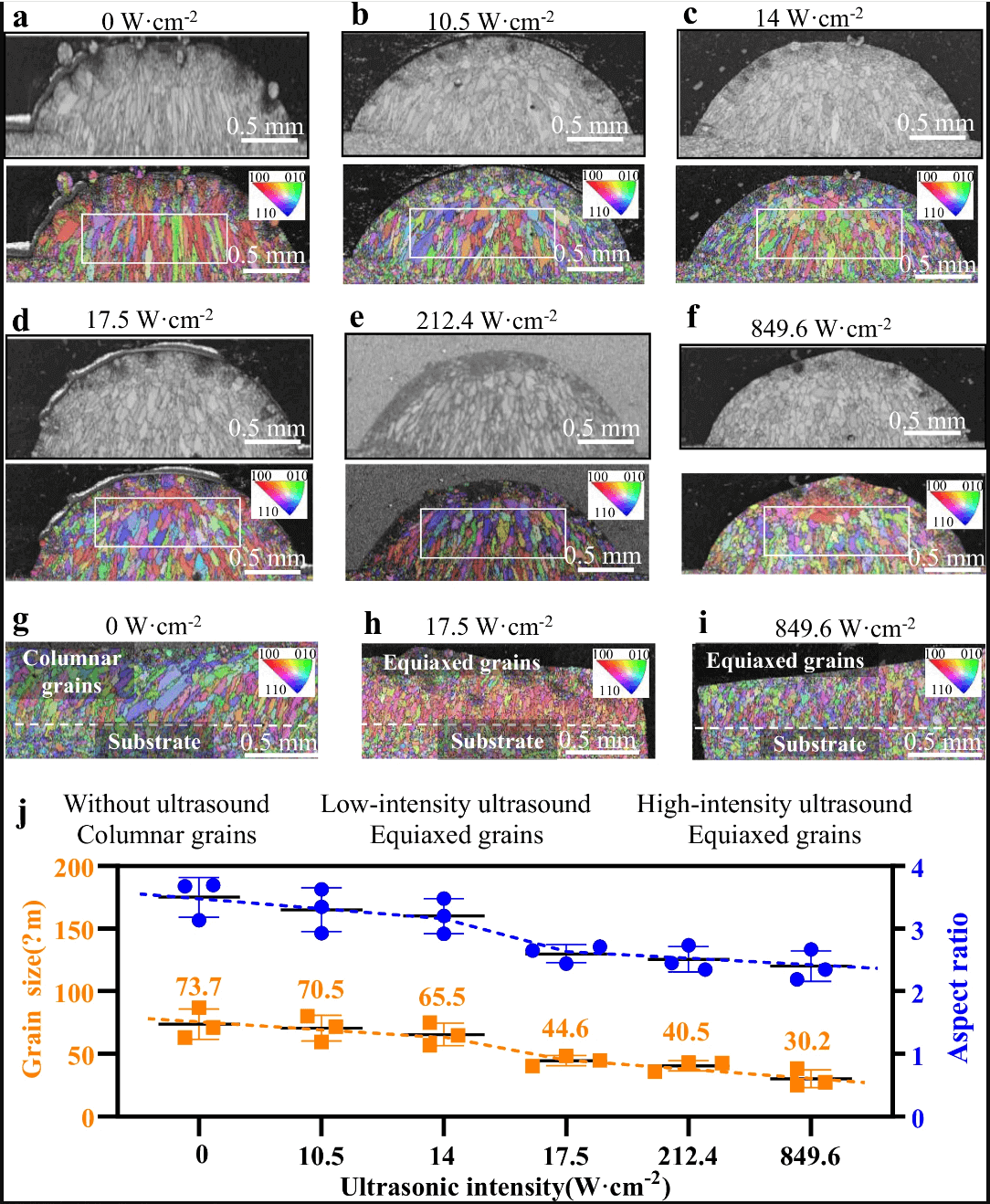 Effect of ultrasound on grain structure of Inconel 718 single tracks. Image via Nature Communications.