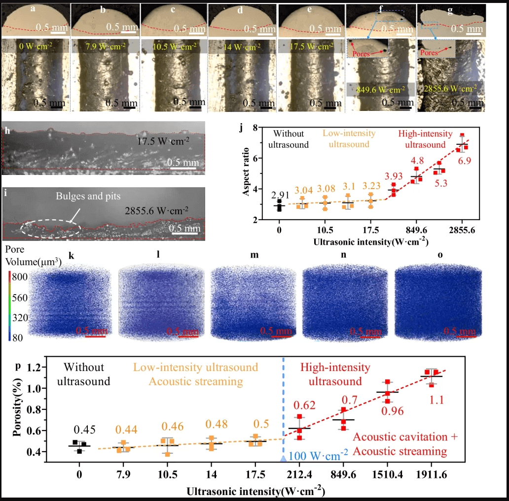 In-situ monitoring and multiphysics simulations clarified the physical mechanism. Low-intensity ultrasound combined with Marangoni-driven flow to generate a high-frequency shaking motion in the melt pool. This motion subjected dendrite arms to cyclic stresses exceeding the material’s 37.3 MPa yield strength, causing fatigue fracture and fragmentation. Calculations showed dendrite stress rising from 30.9 MPa without ultrasound to 71.3 MPa under non-contact ultrasound. Unlike cavitation, which produces violent bubble collapse and shock waves, acoustic streaming maintained a stable melt pool surface. Porosity under low-intensity conditions rose only marginally, from 7.9 to 17.5 W·cm², confirming that defects were avoided while refinement occurred.
